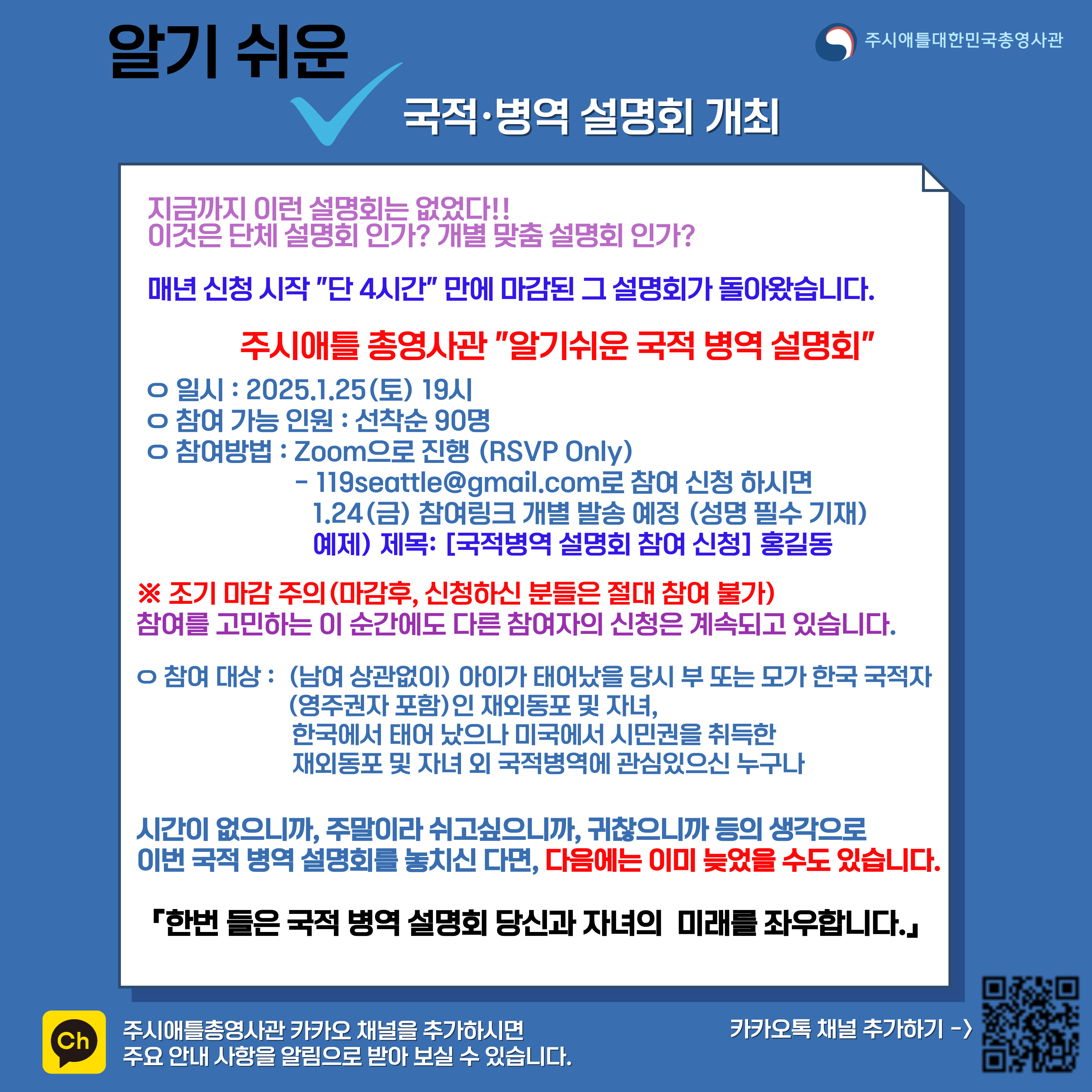 국적병역 설명회 참여 신청 방법 (신청 이메일 주소 : 119seattle@gmail.com)