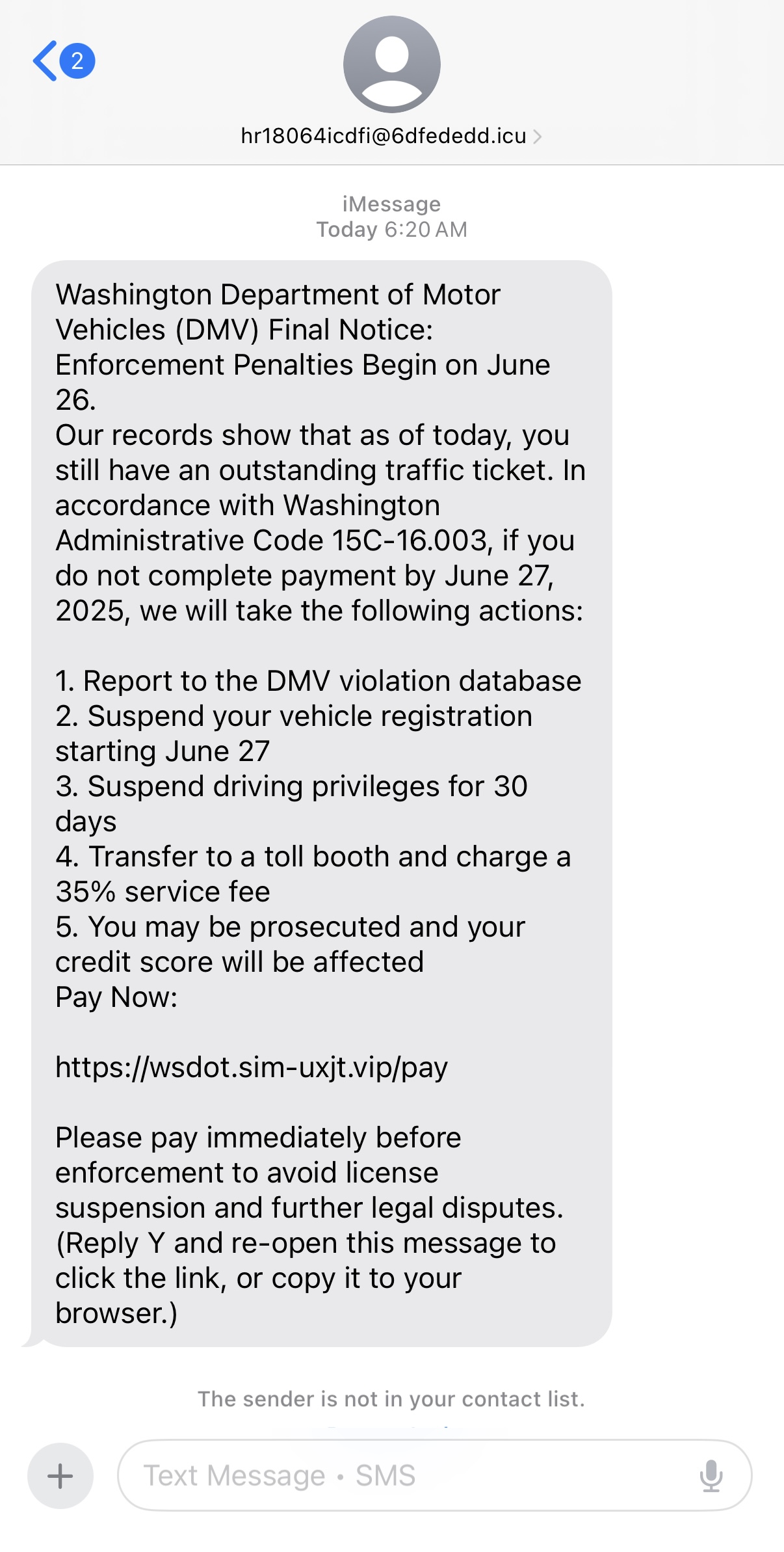 [워싱턴주 교통국 및 면허국 사칭 스미싱(문자 피싱) 사기 주의 안내 ]